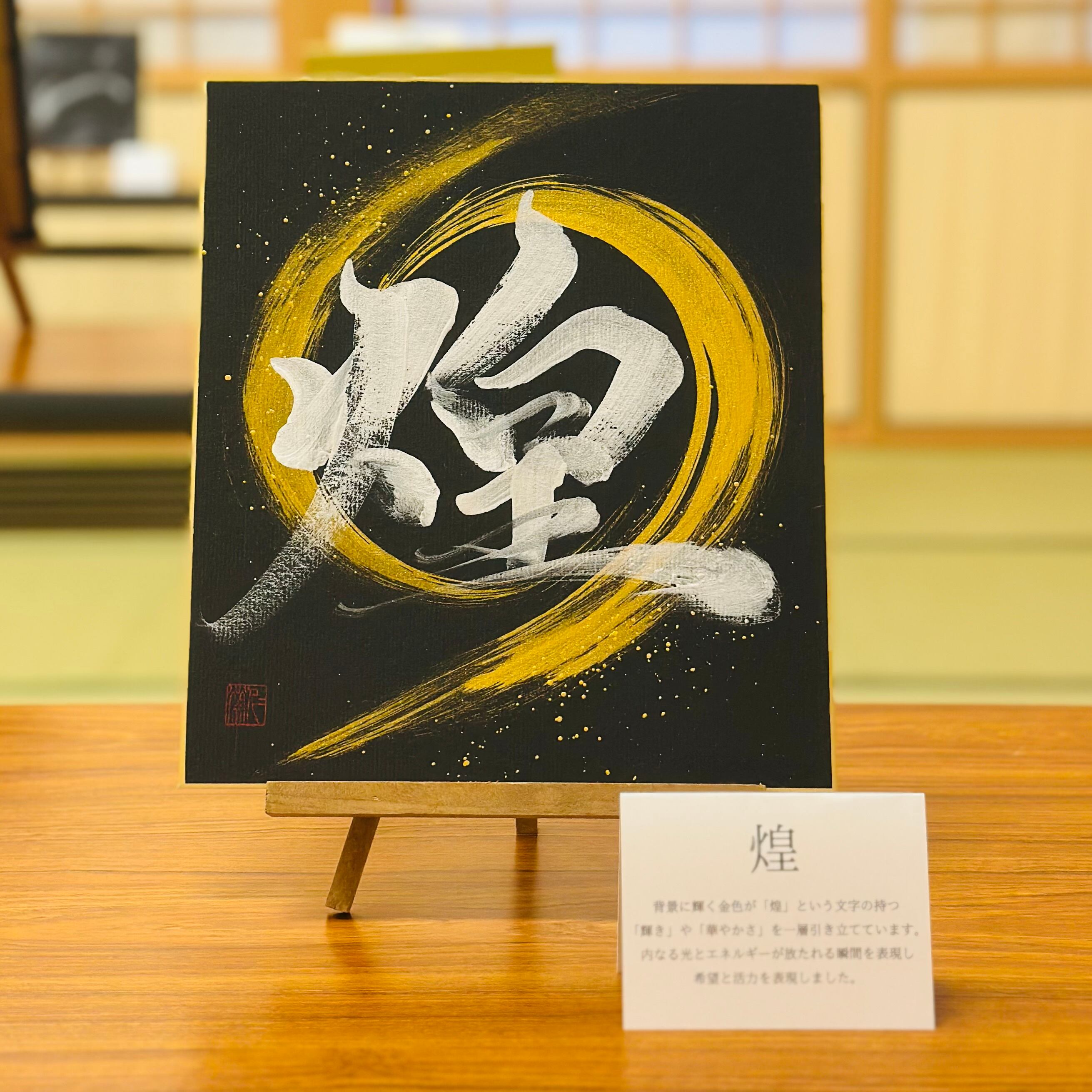 背景に輝く金色が「煌」という文字の持つ「輝き」や「華やかさ」を一層引き立てています。