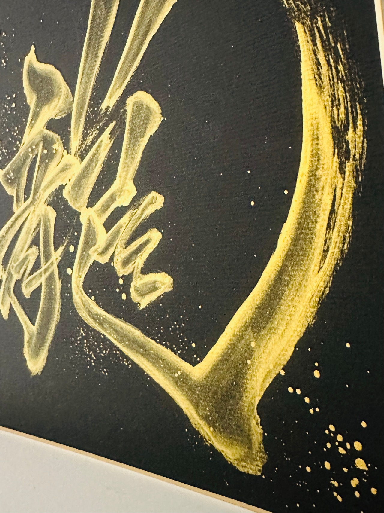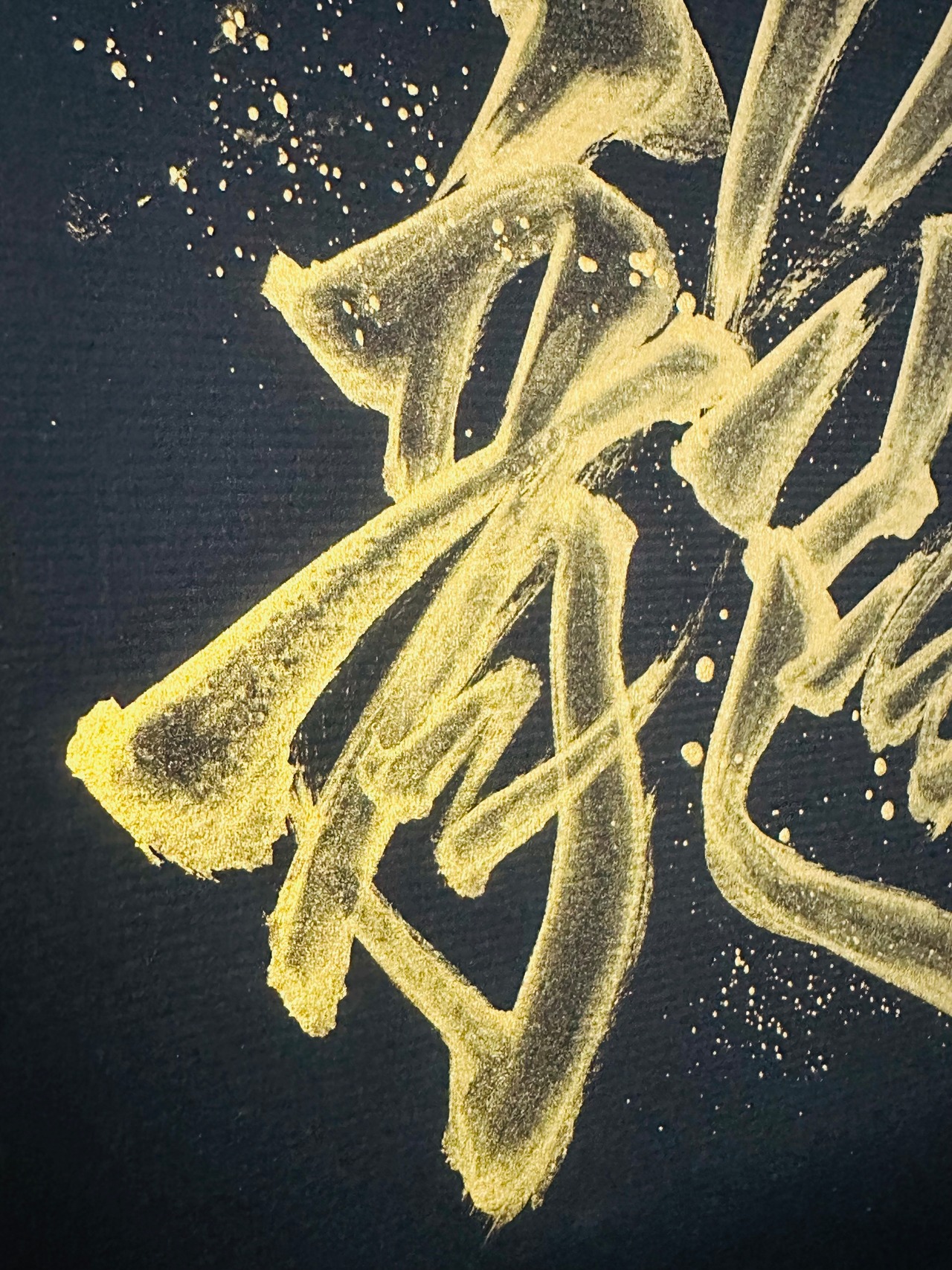 線一本一本の中心部分を特殊技法でくり抜き、文字に立体感をもたせ、神々しさのある作品に仕上げました。